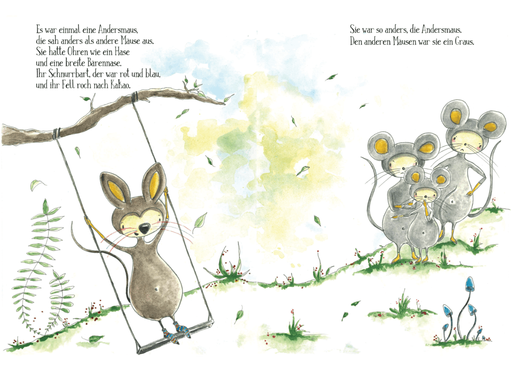 Sie hat Ohren wie ein Hase, liebt Gurkeneintopf mit Schokolade und spricht eine lustige Mäusesprache. Die Andersmaus mag sich so, wie sie ist. Nur die anderen Mäuse finden sie komisch. Sie lachen die Andersmaus aus und halten sich lieber von ihr fern. Bis ein Mäusekind entdeckt, dass sie gar nicht so anders ist…